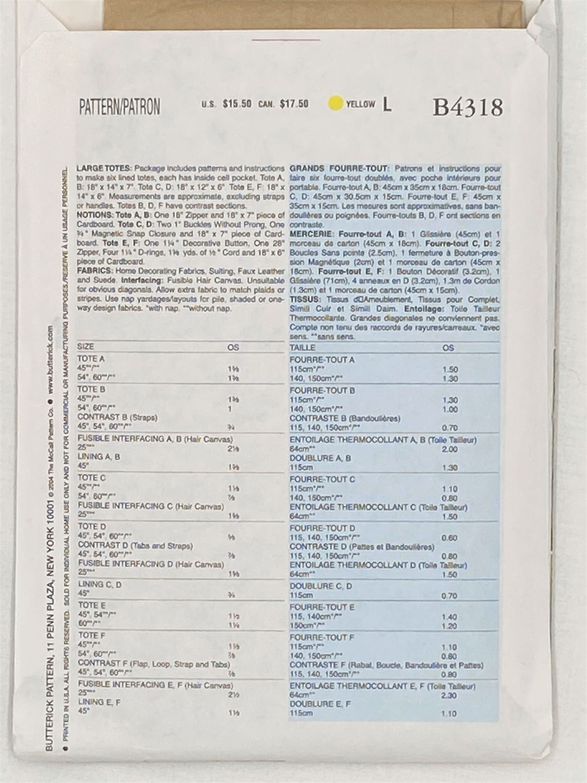 Butterick Sewing Pattern B4318 Lined Tote Bag Accessory Etsy